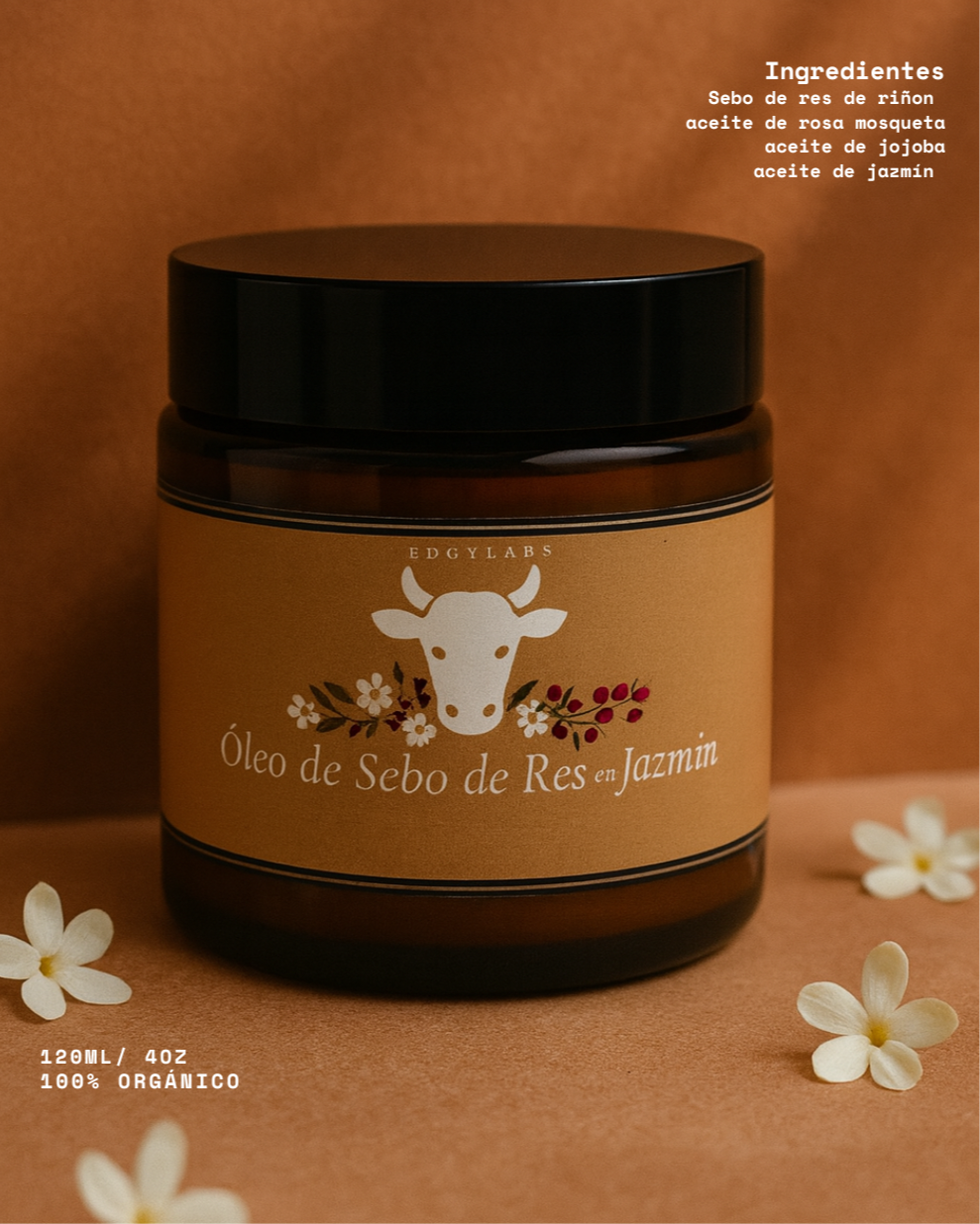 El Óleo de Sebo de Res en Jazmín es una fórmula ligera y profunda elaborada con sebo de res de riñón (la fuente más rica en nutrientes esenciales para la piel) aceite de jojoba, aceite de jazmín y aceite de rosa mosqueta. Esta combinación magistral regula el exceso de grasa, ayuda a minimizar imperfecciones y aporta luminosidad natural sin obstruir los poros.